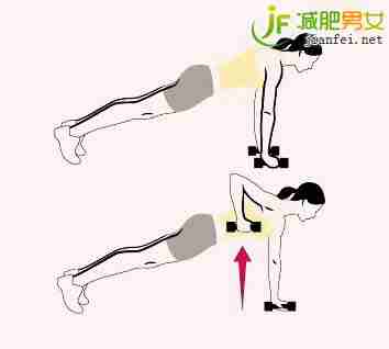 双手抓住哑铃,如同俯卧撑的动作一样双手撑住地面,身体平衡后开始用一侧手臂抓住哑铃缓慢抬起,在抬举的过程中手臂会带动背部脂肪运动,哑铃越重锻炼效果越好。两侧手臂交换练习,每天坚持每侧手臂做15-20次即可。坚持一周就能看到手臂上的拜拜肉变少,背部肉肉变紧致哦,连肩周酸疼都能得到缓解。