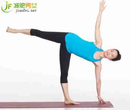 站姿,左脚撑地,右脚抬离地板,右膝盖弯曲90度,大腿面绷直,右脚绷直并指向地板,背部打直,双手叉在腰间部,肩膀向后打开,挺胸收腹,腿部一定要撑紧撑直,换到另一边重复做。