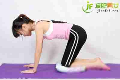 step2:身体向前弯曲,将折好的毛巾垫在膝盖下方,双臂伸直撑地,抬起臀部,头部放低,面部朝向地板,大腿面绷直,臀部微微后靠,伸直背部。