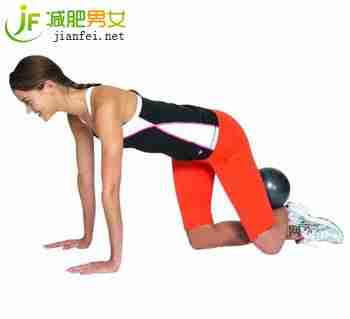 1、四肢着地,健身球置于左膝之后,收紧小腿。接着交叠两脚脚跟,左膝向左侧张开。Tip:加入健身球作为辅助锻炼道具,可以更快收到调节身段线条的效果。