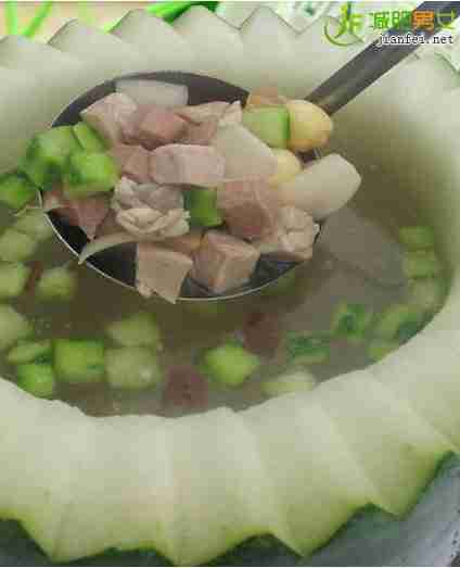 制法:清水、姜片、冬瓜粒滚熟,再加人瘦肉慢火浸熟即成。