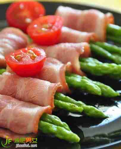 2、番茄切小丁,红椒切丝,芦笋切长段飞水捞出待用。