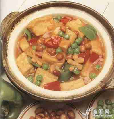 四神粉煲豆腐的做法是:将600克豆腐切块抹上少许盐,50克冬菇去蒂,20克胡萝卜切片。油锅烧热后,放入豆腐,稍油炸后捞起。最后,将豆腐、冬菇、笋片、胡萝卜放入煲锅后,再将酱油、料酒及调水后的四神粉倒入锅内。武火烧沸后,转文火煲1个小时,起锅前撒上葱花。