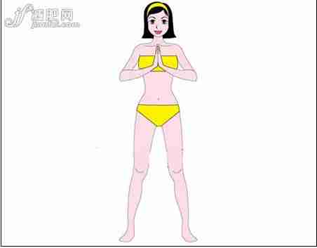 双脚打开与肩同宽,双手合十放在胸前,挺胸收腹,肩膀放轻松,吸气预备。双脚跨度要与肩同宽,过宽或过窄会影响之后做动作的效果。