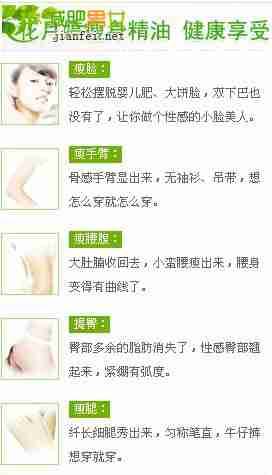 花月婷瘦身精油的减肥原理是用精油涂抹于肥胖部位通过亲和作用进皮下组织,又经体液替换进入血液和淋巴,匆匆进了血液和淋巴循环,从而放慢人体的新陈代谢。排出多余脂肪,减少脂肪沉积,从源头上杜绝肥胖,健康减肥。塑身精油不经过肠道及脏腑器官,对人体没有任何副作用。点击进入花月婷瘦身精油官方销售网站>>>