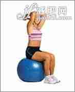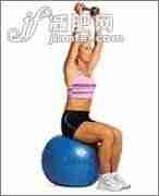 双手抓住哑铃的边缘,坐在一个膨胀的锻炼球上(如果没有锻炼球,也可以坐在椅子的边缘)。收紧你的腹部,这样你就不会弓起背。把哑铃举过头顶,把你的胳膊肘靠近你的耳朵。
