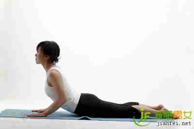 3、吐气,慢慢弯曲手臂,让腰部、胸部、颈部依次回到地面,恢复俯卧的姿势。可重复这个姿势3~5次。