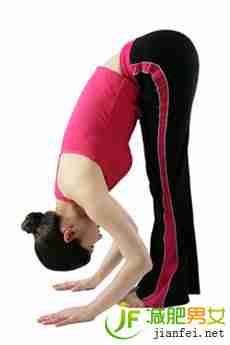 自然站立,呼气,上身慢慢向前屈,直到双手或者手指接触到双脚,前额碰触双腿,保持膝盖挺直。如果柔韧性不够,可以将双手放在地上。