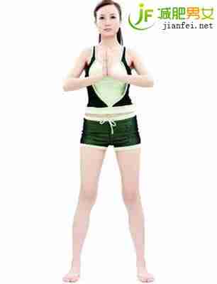 将双脚慢慢打开,直至与肩同宽,双手合十放在胸前,挺胸收腹,肩膀放轻松,吸气预备。