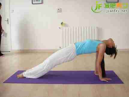 3、吸气,臀部向上抬起,让身体成一字,腰、胸用力向上。