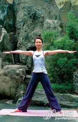 step1:双脚打开,吸气将双臂抬至水平,呼气,放松双肩,将掌心翻转向下。双眼平视前方。
